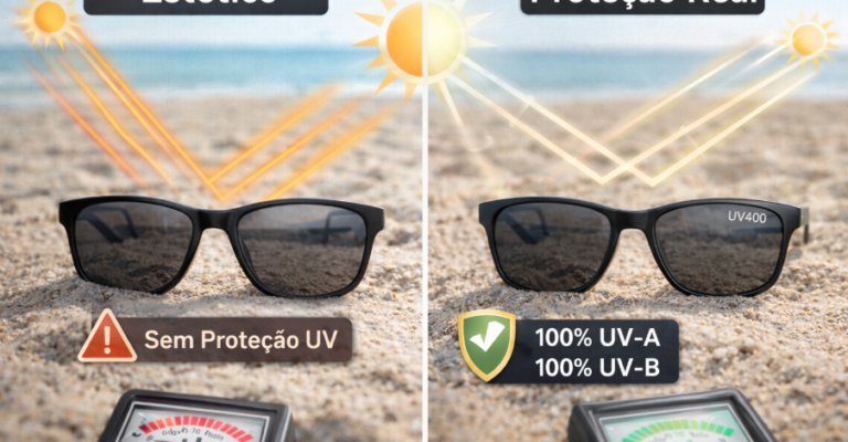 Outra diferença importante está na certificação e procedência. Óculos com proteção real seguem normas técnicas e informam claramente o nível de proteção UV oferecido. Já os modelos puramente estéticos, geralmente vendidos sem especificações, não garantem nenhum benefício à saúde ocular.